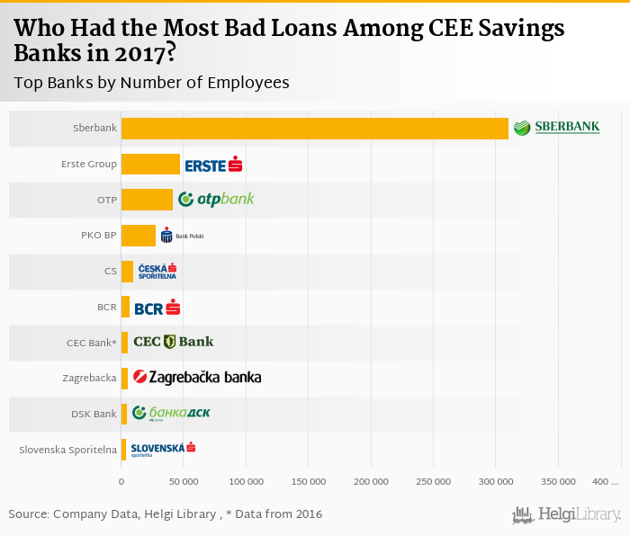 Based on a comparison of 10 banks among CEE Savings Banks in 2017, Sberbank had the most employees, followed by Erste Group Bank and OTP Group.