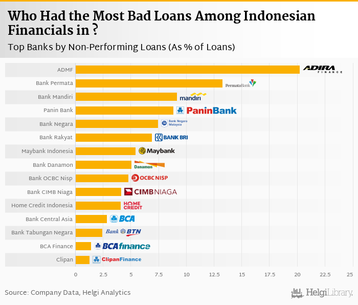 Based on a comparison of 17 banks among Indonesian Financials in 2018, Adira Dinamika Multi Finance had the highest share of bad loans, followed by Bank Permata and Bank Mandiri.