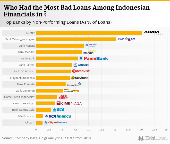 Based on a comparison of 17 banks among Indonesian Financials in 2019, Adira Dinamika Multi Finance had the highest share of bad loans, followed by Bank Tabungan Negara and Bank Negara.