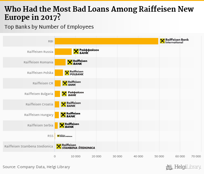 Based on a comparison of 11 banks among Raiffeisen New Europe in 2017, Raiffeisen Bank Int. had the most employees, followed by Raiffeisenbank Russia and Raiffeisen Bank Romania.