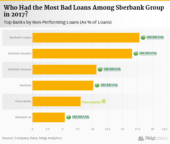 Based on a comparison of 6 banks among Sberbank Group in 2017, Sberbank Croatia had the highest share of bad loans, followed by Sberbank Slovakia and Sberbank Slovenia.