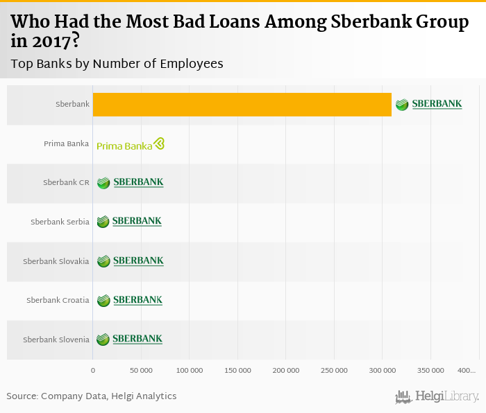 Based on a comparison of 7 banks among Sberbank Group in 2017, Sberbank had the most employees, followed by Prima Banka Slovakia and Sberbank Czech Republic.