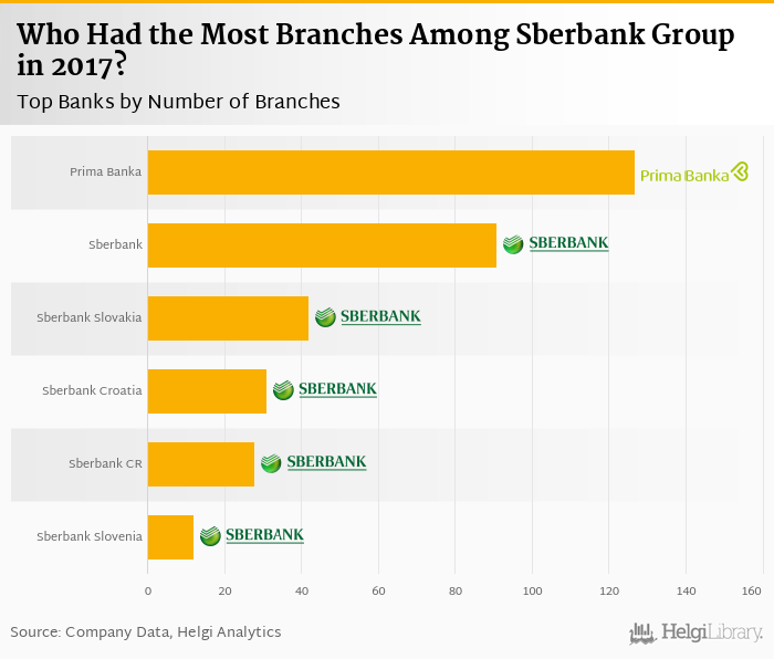 Based on a comparison of 6 banks among Sberbank Group in 2017, Prima Banka Slovakia had the most branches, followed by Sberbank and Sberbank Slovakia.