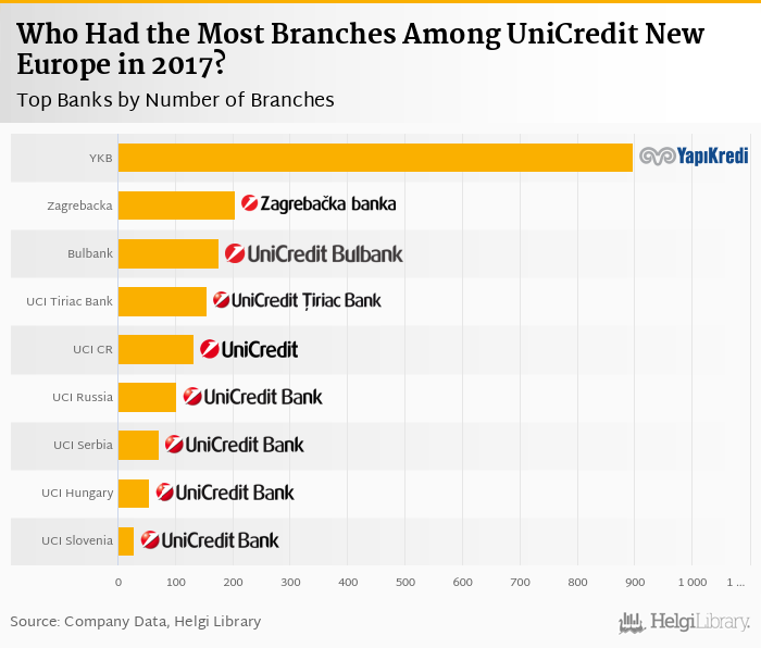 Based on a comparison of 10 banks among UniCredit New Europe in 2017, Yapi Kredi Bank had the most branches, followed by Zagrebacka Banka and UniCredit Bulbank.