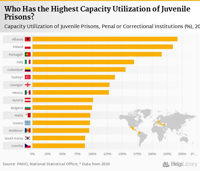 Based on a comparison of 38 countries in 2012, Albania ranked the highest in capacity utilization of juvenile prisons, penal or correctional institutions with 243% followed by Poland and Portugal. On the other end of the scale was Japan with 0.305%, Slovenia with 1.28% and Azerbaijan with 13.5%.