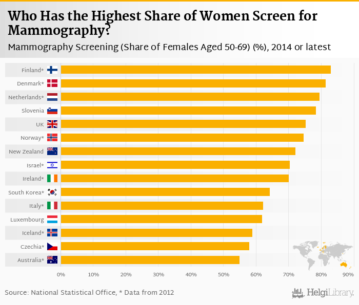 Based on a comparison of 24 countries in 2014, Finland ranked the highest in mammography screening of females aged 50-69 as a share of total with 83.0% followed by Denmark and Netherlands. On the other end of the scale was Turkey with 15.1%, Mexico with 17.5% and Chile with 28.3%.
