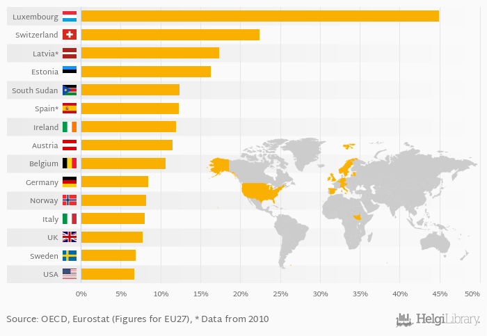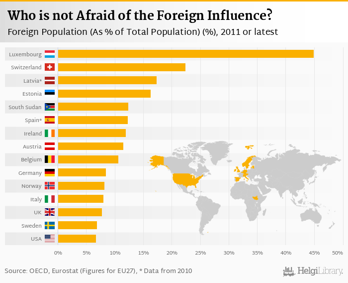 Based on a comparison of 32 countries in 2011, Luxembourg ranked the highest in foreign population as a percentage of total population with 44.9% followed by Switzerland and Latvia. On the other end of the scale was Poland with 0.145%, Mexico with 0.244% and Slovakia with 0.872%.