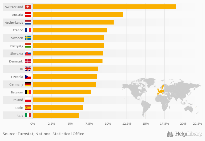 | Switzerland | % | ... | ... | ... | ... | ... | ... | ... | ... | ... | ... | ... | 17.4% | 17.6% | 17.6% | 17.2% | 18.7% | |||||