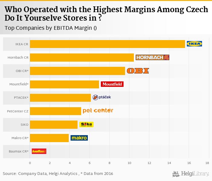 Based on a comparison of 9 firms among Czech Do It Yourselve Stores, IKEA Czech Republic generated the highest EBIIDA Margin in 2017 followed by Hornbach Baumarkt Czech Republic and OBI Czech Republic.