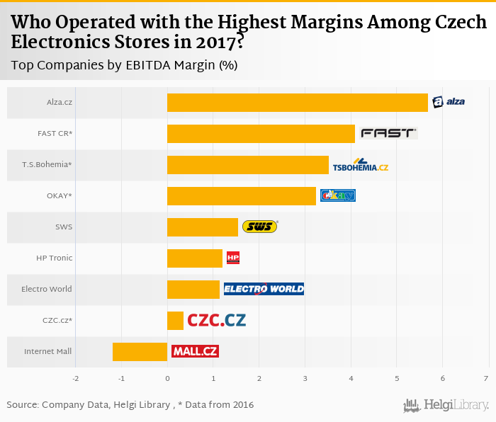 Based on a comparison of 10 firms among Czech Electronics Stores, Alza.cz generated the highest EBIIDA Margin in 2017 followed by FAST Czech Republic and T.S.Bohemia.