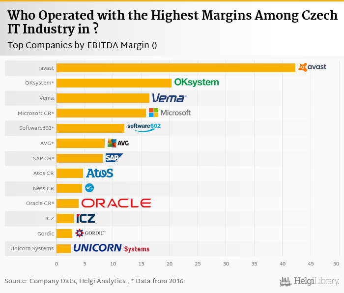 Based on a comparison of 14 firms among Czech IT Industry, Avast generated the highest EBIIDA Margin in 2017 followed by OKsystem and Vema.