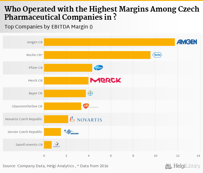 Based on a comparison of 9 firms among Czech Pharmaceutical Companies, Amgen Czech Republic generated the highest EBIIDA Margin in 2017 followed by Roche Czech Republic and Pfizer Czech Republic.