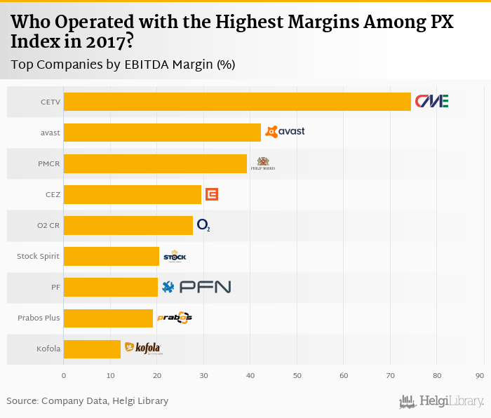 Based on a comparison of 9 firms among PX Index, Central European Media Enterprises generated the highest EBIIDA Margin in 2017 followed by Avast and Philip Morris Czech Republic.
