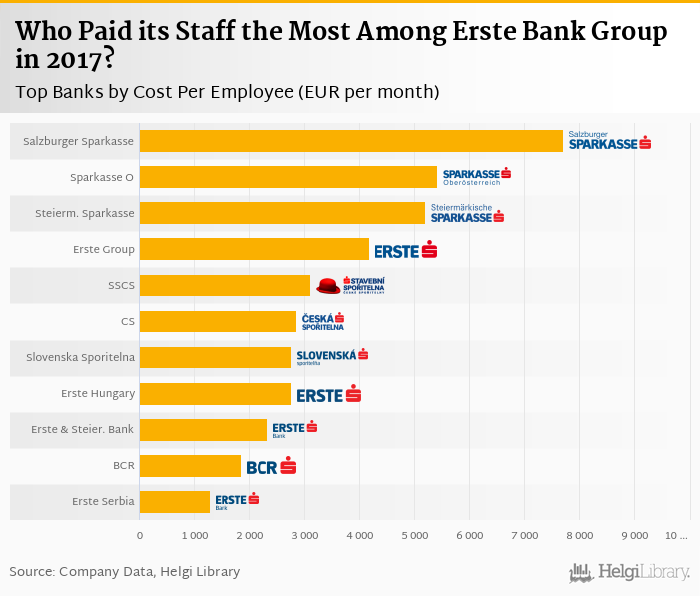 Based on a comparison of 11 banks among Erste Bank Group in 2017, Salzburger Sparkasse was paying its employees the best, followed by Sparkasse Oberosterreich and Steiermarkische Sparkasse.