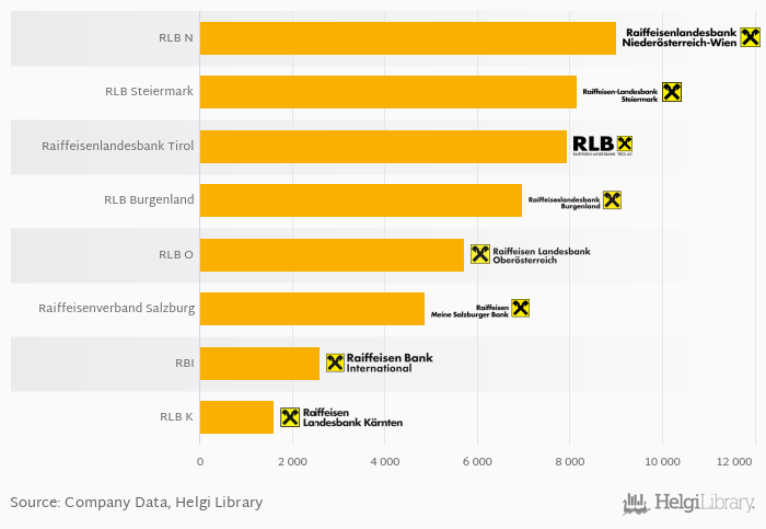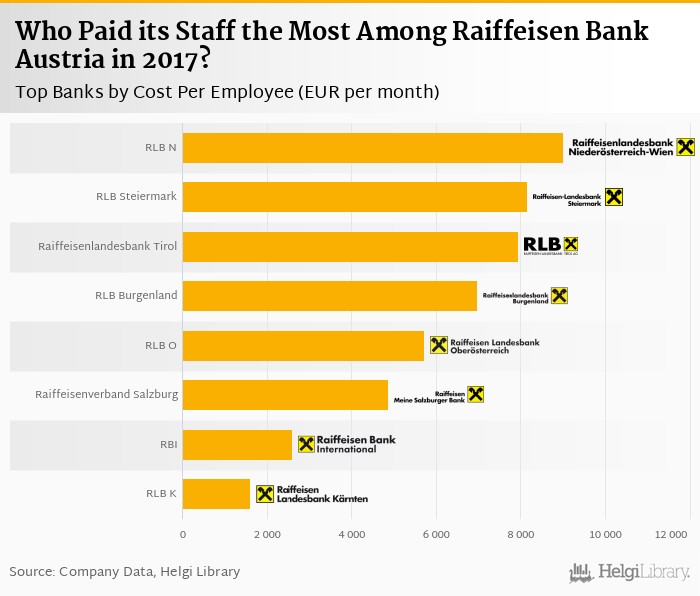 Based on a comparison of 8 banks among Raiffeisen Bank Austria in 2017, Raiffeisenlandesbank Niederosterreich-Wien was paying its employees the best, followed by Raiffeisenlandesbank Steiermark and Raiffeisenlandesbank Tirol.