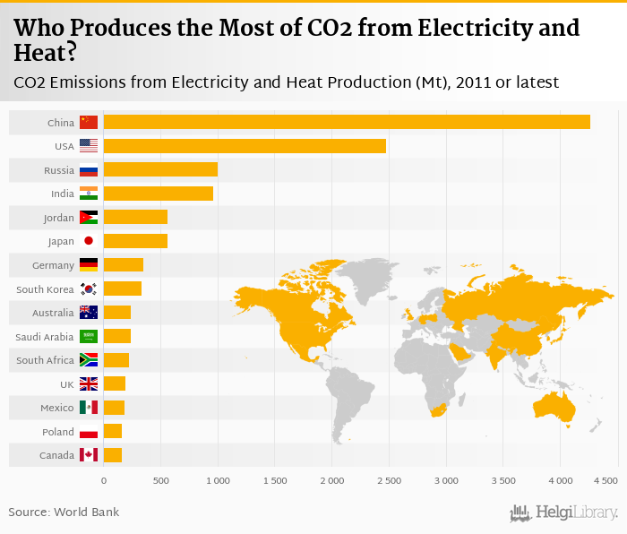 Based on a comparison of 128 countries in 2011, China ranked the highest in CO2 emissions from electricity and heat production with 4,266 Mt followed by USA and Russia. On the other end of the scale was Nepal with 0.010 Mt, Dem. Republic of the Congo with 0.030 Mt and Togo with 0.030 Mt.