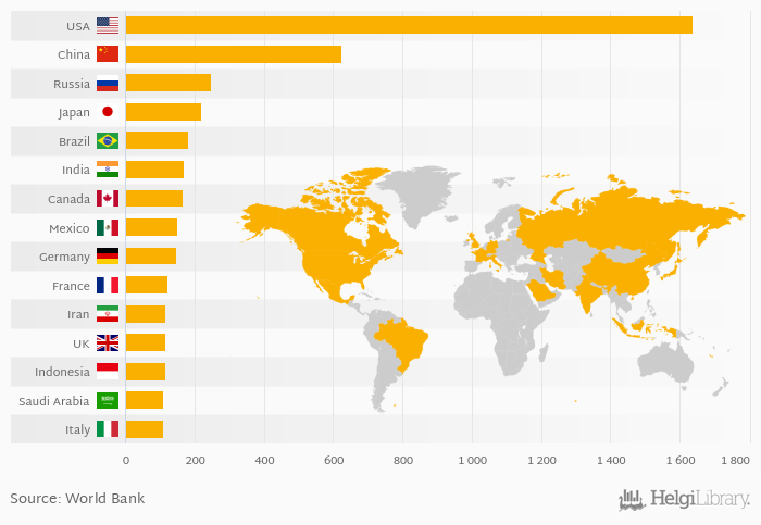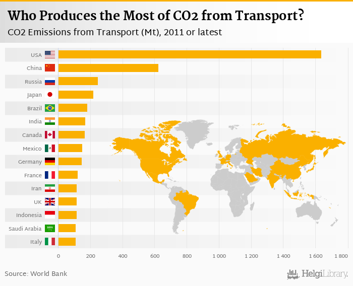 Based on a comparison of 135 countries in 2011, USA ranked the highest in CO2 emissions from transport with 1,638 Mt followed by China and Russia. On the other end of the scale was Eritrea with 0.150 Mt, Tajikistan with 0.310 Mt and Tanzania with 0.310 Mt.