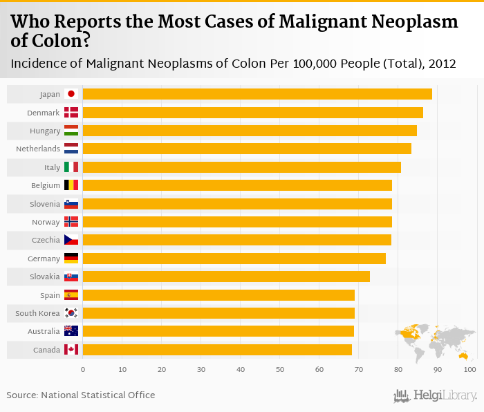 Based on a comparison of 44 countries in 2012, Japan ranked the highest in incidence of malignant neoplasms of colon per 100,000 people (total) with 88.7 followed by Denmark and Hungary. On the other end of the scale was India with 5.22, Mexico with 7.18 and South Africa with 8.99.