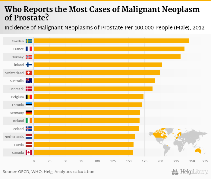 Based on a comparison of 44 countries in 2012, Sweden ranked the highest in incidence of malignant neoplasms of prostate per 100,000 people (male) with 245 followed by France and Norway. On the other end of the scale was India with 2.99, China with 6.57 and Indonesia with 11.0.