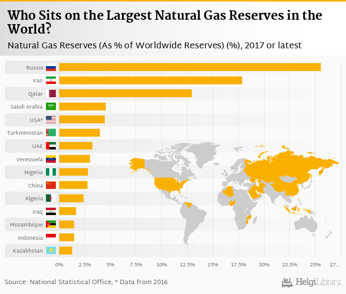 Based on a comparison of 98 countries in 2017, Russia ranked the highest in natural gas reserves as a share of worldwide reserves with 25.6% followed by Iran and Qatar. On the other end of the scale was Albania with < 0.001%, Dem. Republic of the Congo with < 0.001% and Greece with < 0.001%.