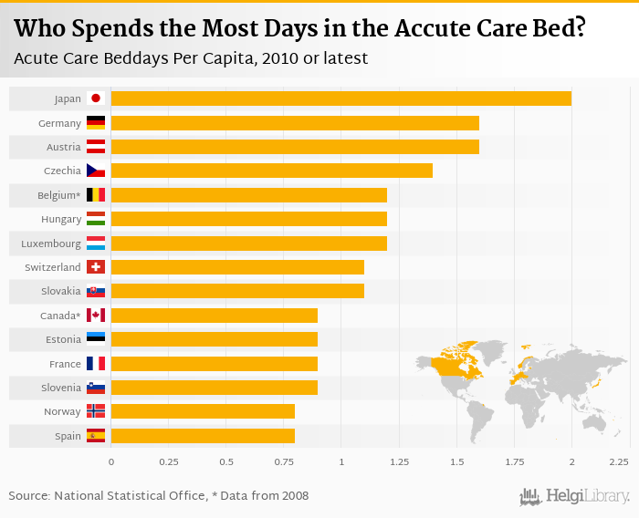 Based on a comparison of 28 countries in 2010, Japan ranked the highest in acute care beddays per capita with 2.00 followed by Germany and Austria. On the other end of the scale was Mexico with 0.400, USA with 0.600 and Turkey with 0.600.