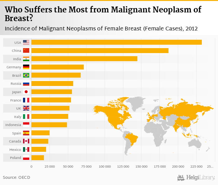 Based on a comparison of 44 countries in 2012, USA ranked the highest in incidence of malignant neoplasms of female breast (female cases) with 232,714 followed by China and India. On the other end of the scale was Iceland with 225, Luxembourg with 360 and Estonia with 658.