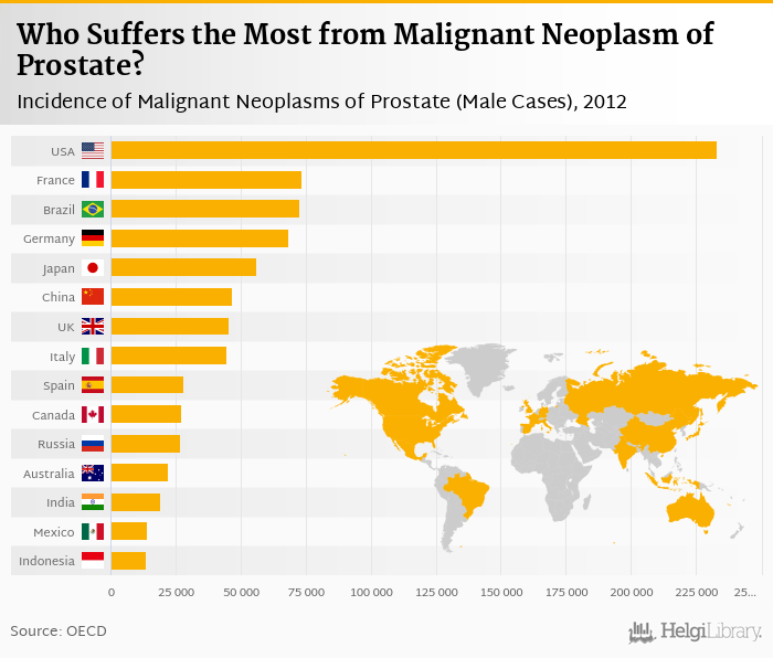 Based on a comparison of 44 countries in 2012, USA ranked the highest in incidence of malignant neoplasms of prostate (male cases) with 233,159 followed by France and Brazil. On the other end of the scale was Iceland with 273, Luxembourg with 336 and Estonia with 1,021.