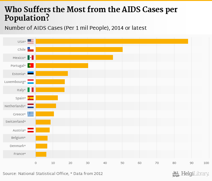 Based on a comparison of 33 countries in 2014, USA ranked the highest in number of aids cases per 1 mil people inhabitants with 88.2 followed by Chile and Mexico. On the other end of the scale was Slovakia with 1.11, Turkey with 1.25 and New Zealand with 1.55.