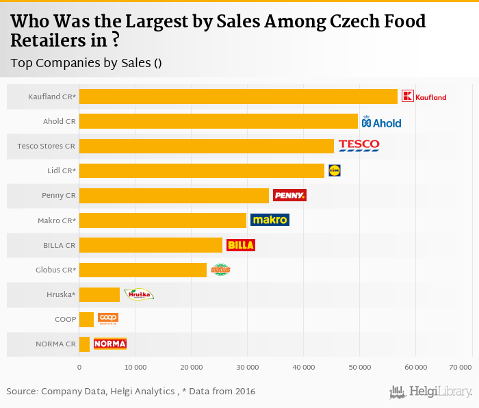 Based on a comparison of 11 firms among Czech Food Retailers, Kaufland Czech Republic generated the highest sales in 2017 followed by Ahold Czech Republic and Tesco Stores Czech Republic.