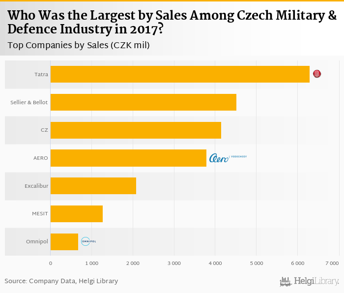 Based on a comparison of 7 firms among Czech Military & Defence Industry, Tatra Trucks generated the highest sales in 2017 followed by Sellier & Bellot and Ceska zbrojovka.