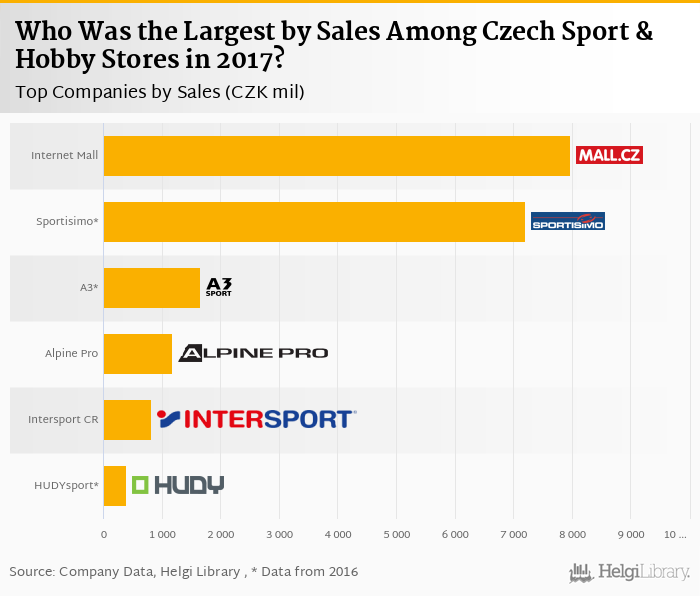 Based on a comparison of 7 firms among Czech Sport & Hobby Stores, Internet Mall generated the highest sales in 2017 followed by Sportisimo and A3 Sport.