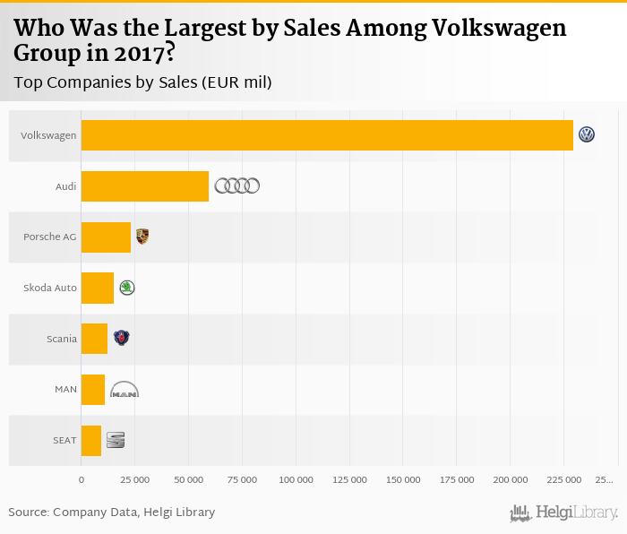 Based on a comparison of 7 firms among Volkswagen Group, Volkswagen Group generated the highest sales in 2017 followed by Audi Group and Porsche AG.