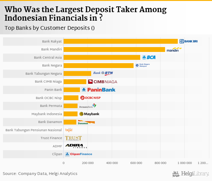 Based on a comparison of 18 banks among Indonesian Financials in 2018, Bank Rakyat was the largest deposit taker, followed by Bank Mandiri and Bank Central Asia.