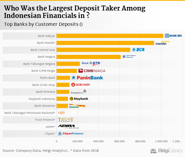 Based on a comparison of 18 banks among Indonesian Financials in 2019, Bank Rakyat was the largest deposit taker, followed by Bank Mandiri and Bank Central Asia.