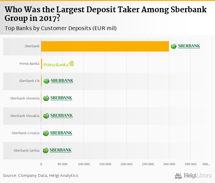Based on a comparison of 7 banks among Sberbank Group in 2017, Sberbank was the largest deposit taker, followed by Prima Banka Slovakia and Sberbank Czech Republic.