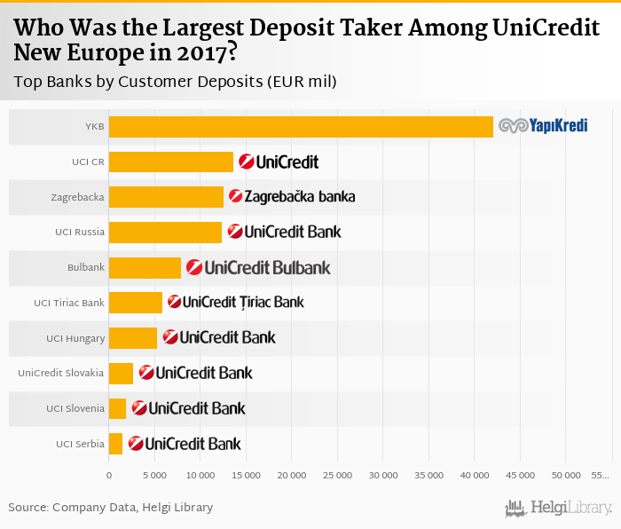 Based on a comparison of 10 banks among UniCredit New Europe in 2017, Yapi Kredi Bank was the largest deposit taker, followed by UniCredit Bank Czecho-Slovakia and Zagrebacka Banka.
