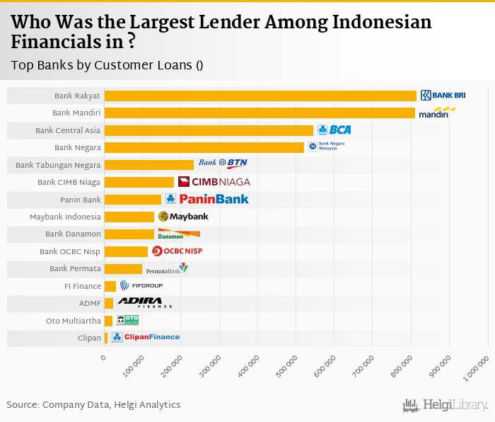 Based on a comparison of 20 banks among Indonesian Financials in 2018, Bank Rakyat was the largest lender, followed by Bank Mandiri and Bank Central Asia.