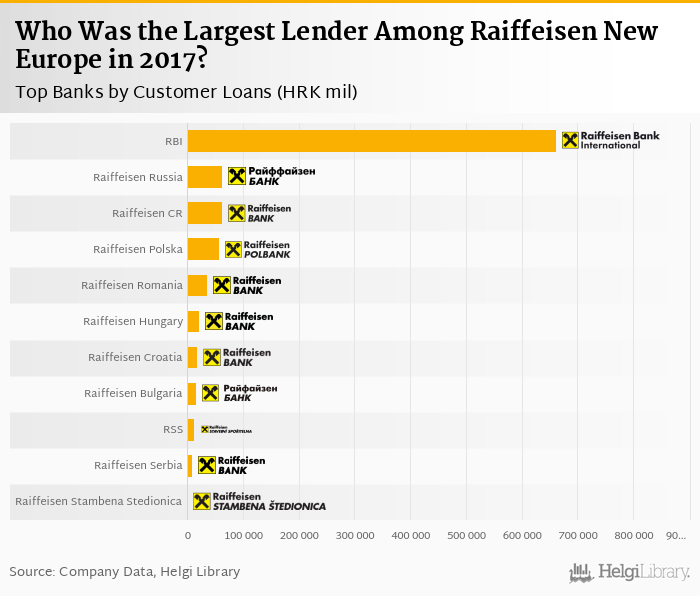 Based on a comparison of 11 banks among Raiffeisen New Europe in 2017, Raiffeisen Bank Int. was the largest lender, followed by Raiffeisenbank Russia and Raiffeisenbank Czech Republic.