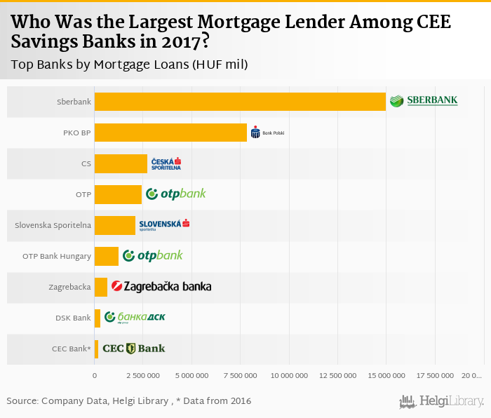 Based on a comparison of 9 banks among CEE Savings Banks in 2017, Sberbank was the largest mortgage lender, followed by PKO BP and Ceska Sporitelna.