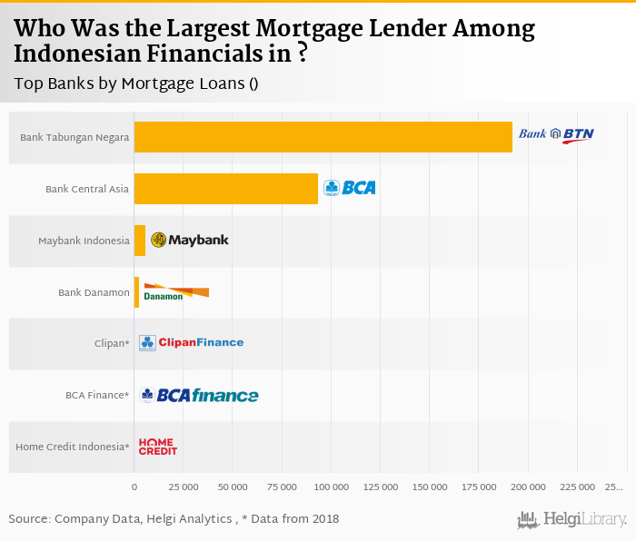 Based on a comparison of 9 banks among Indonesian Financials in 2019, Bank Tabungan Negara was the largest mortgage lender, followed by Bank Central Asia and Maybank Indonesia.