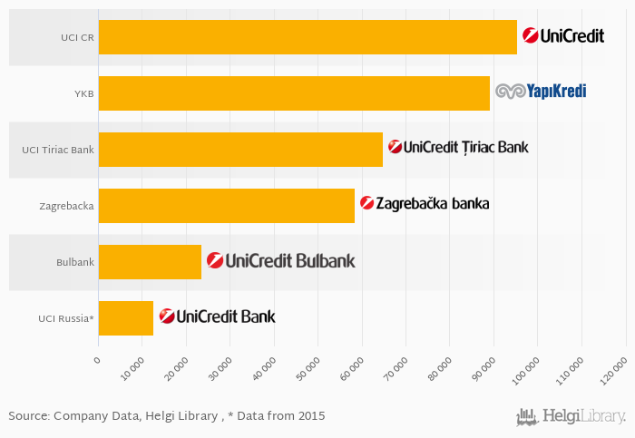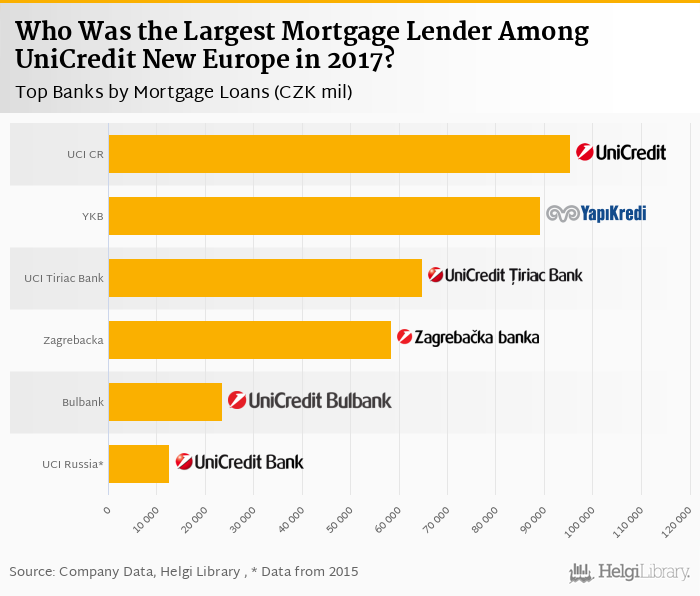 Based on a comparison of 6 banks among UniCredit New Europe in 2017, UniCredit Bank Czecho-Slovakia was the largest mortgage lender, followed by Yapi Kredi Bank and UniCredit Tiriac Bank.