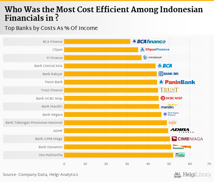 Based on a comparison of 20 banks among Indonesian Financials in 2018, BCA Finance was the most cost efficient bank, followed by Clipan Finance Indonesia and Federal International Finance.