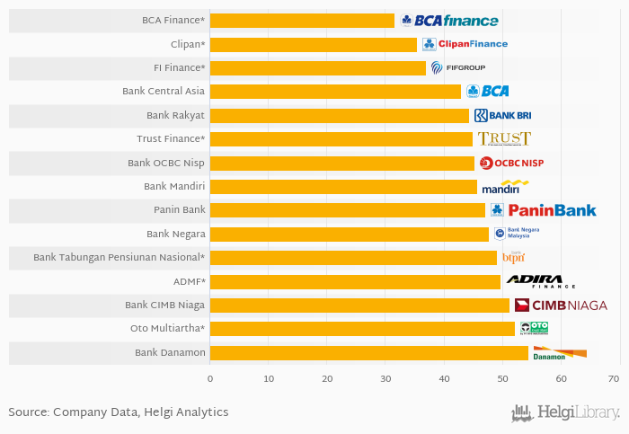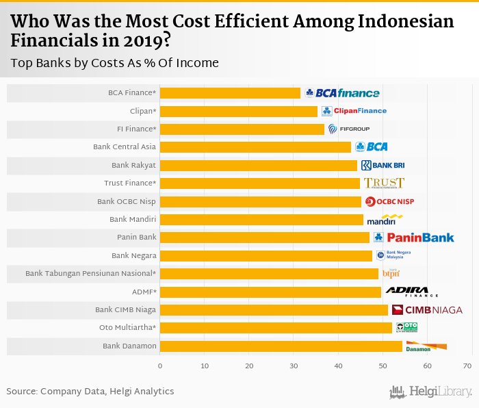 Based on a comparison of 20 banks among Indonesian Financials in 2019, BCA Finance was the most cost efficient bank, followed by Clipan Finance Indonesia and Federal International Finance.