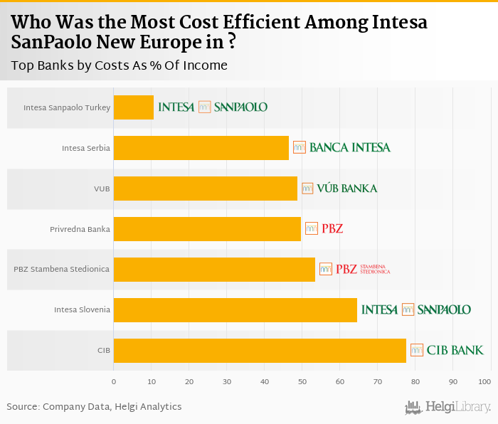 Based on a comparison of 7 banks among Intesa SanPaolo New Europe in 2017, Intesa Sanpaolo Turkey was the most cost efficient bank, followed by Bank Intesa Serbia and VUB Banka.
