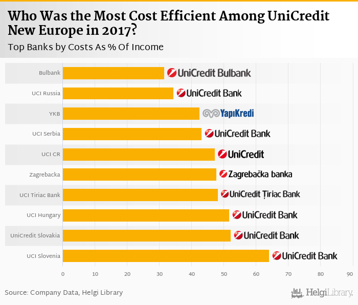 Based on a comparison of 10 banks among UniCredit New Europe in 2017, UniCredit Bulbank was the most cost efficient bank, followed by UniCredit Bank Russia and Yapi Kredi Bank.