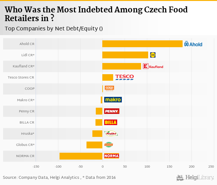 Based on a comparison of 11 firms among Czech Food Retailers, Ahold Czech Republic had the biggest debt relative to its equity at the end of 2017 followed by Lidl Czech Republic and Kaufland Czech Republic.