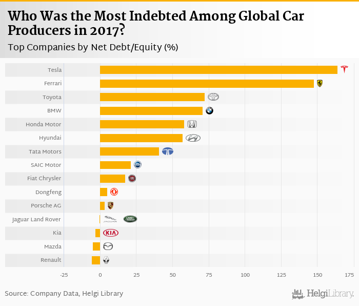 Based on a comparison of 31 firms among Global Car Producers, Tesla Inc. had the biggest debt relative to its equity at the end of 2017 followed by Ferrari and Toyota Motor Corporation.