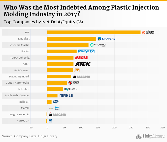 Based on a comparison of 21 firms among Plastic Injection Molding Industry, Bohm Plast-Technik had the biggest debt relative to its equity at the end of 2017 followed by Linaplast and Viscuma Plastic.