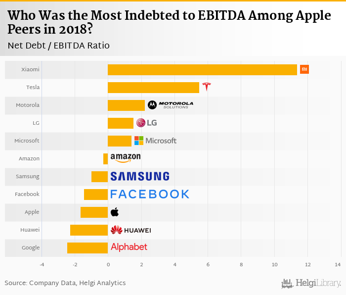 Based on a comparison of 0 firms among Apple Peers, had the biggest debt relative to its EBITDA at the end of 2018 followed by and .