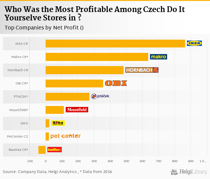 Based on a comparison of 9 firms among Czech Do It Yourselve Stores, IKEA Czech Republic generated the highest net profit in 2017 followed by Makro Cash & Carry Czech Republic and Hornbach Baumarkt Czech Republic.